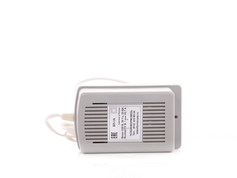питание, В 220В Блок питания БП- 1A включается в сеть 220В и обеспечивает стабилизированное низковольтное питание 12В для всех элементов системы. Блок питания БП-1A обеспечивает выходное напряжение 12В при токе нагрузки до 0,7А. Блок питания выполнен в пластмассовом корпусе, рассчитанным на настенное крепление с помощью 2 шурупов. Сетевой шнур с вилкой имеет длину 1,5м. Низковольтные клеммы размещены на нижней поверхности блока питания и имеют маркировку полярности. На нижней поверхности корпуса имеется светодиодный индикатор, который показывает наличие напряжения питания на выходе БП-1A. Габариты 75x60x121мм, масса 0,75Кг.